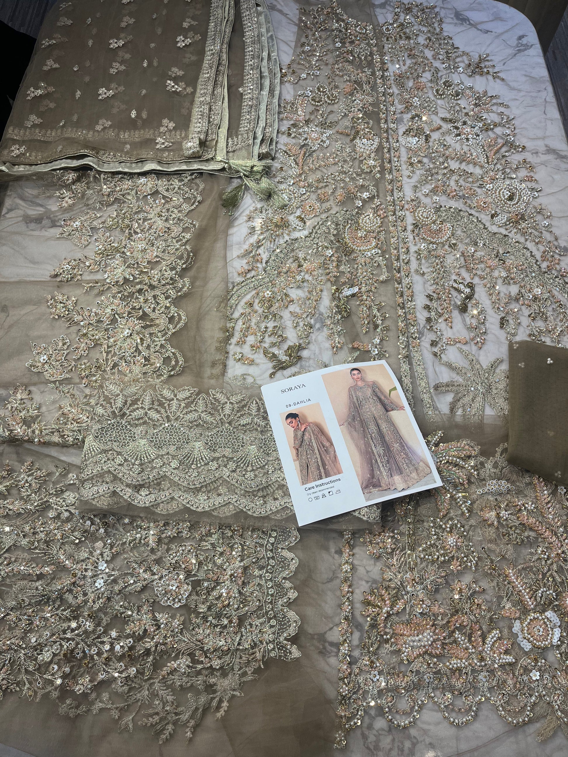 Dahlia is a modern technique masterpiece essayed in dull gold & skin shades curating an enchanted bridal piece. A mesmerizing net gown beautified with multi-hued pastel shaded work ornamented with gangajamni with sheesha details further fused with dabka and katdana work. A ravishing net dupatta modified with sequins laces and striking raw silk crushed pants adorned with organza borders makes it a statement attire for a perfect wedding day.