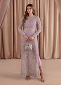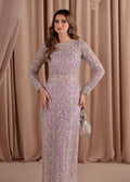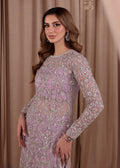 Step into the spotlight in our mesmerizing lilac long dress, adorned with magnificent silver embellishments that promise to dazzle and enthrall. Meticulously crafted from luxurious organza fabric, this ensemble seamlessly blends timeless charm with modern allure. The dress cascades gracefully, enveloping you in a regal aura that commands attention, while its form-fitting bodice accentuates your curves. Delicate embroidery, shimmering sequins, and elaborate embellishments add opulence and sparkle, elevating your style to new heights. Completing this show-stopping look are cigarette pants in the same captivating lilac hue, adorned with silver tissue side seams for a striking finish. Get ready to captivate hearts and steal the spotlight with this exquisite ensemble.