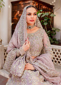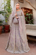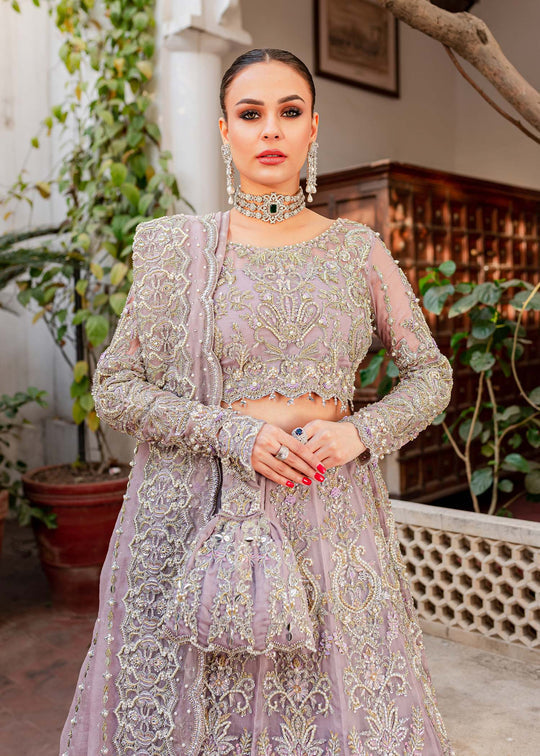 An elegant rhyme to tradition, Mushq is a lehnga choli creating aesthetical magic with its eye catching hues of lilac and delicate motifs. The organza lehanga choli shines with embellishments and amalgamation of floral and geometrical patterns. The outfit is heavily embroidered and hand embellished with naqshi, dabka, crystals, pearls and sequin. The perfect opulent outfit is paired with an organza dupatta which is adorned with four sided embellished border and vertical embellished lines at the center with extended pallu.