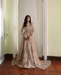 'Dazzle in reine’s golden splendor with its paneled frock, where Persian garden-inspired motifs bloom across silk with double-colored foil print. The sweetheart neckline opens to a canvas of exquisite hand-embellishments, zardosi, mukaish, crystals, and pearls, telling tales of opulence. The hem border radiates with silver handwork creepers and precise laser detailing, while the sequined four-sided dupatta captures light with every movement, framed by silver lace and delicate pearl handwork.