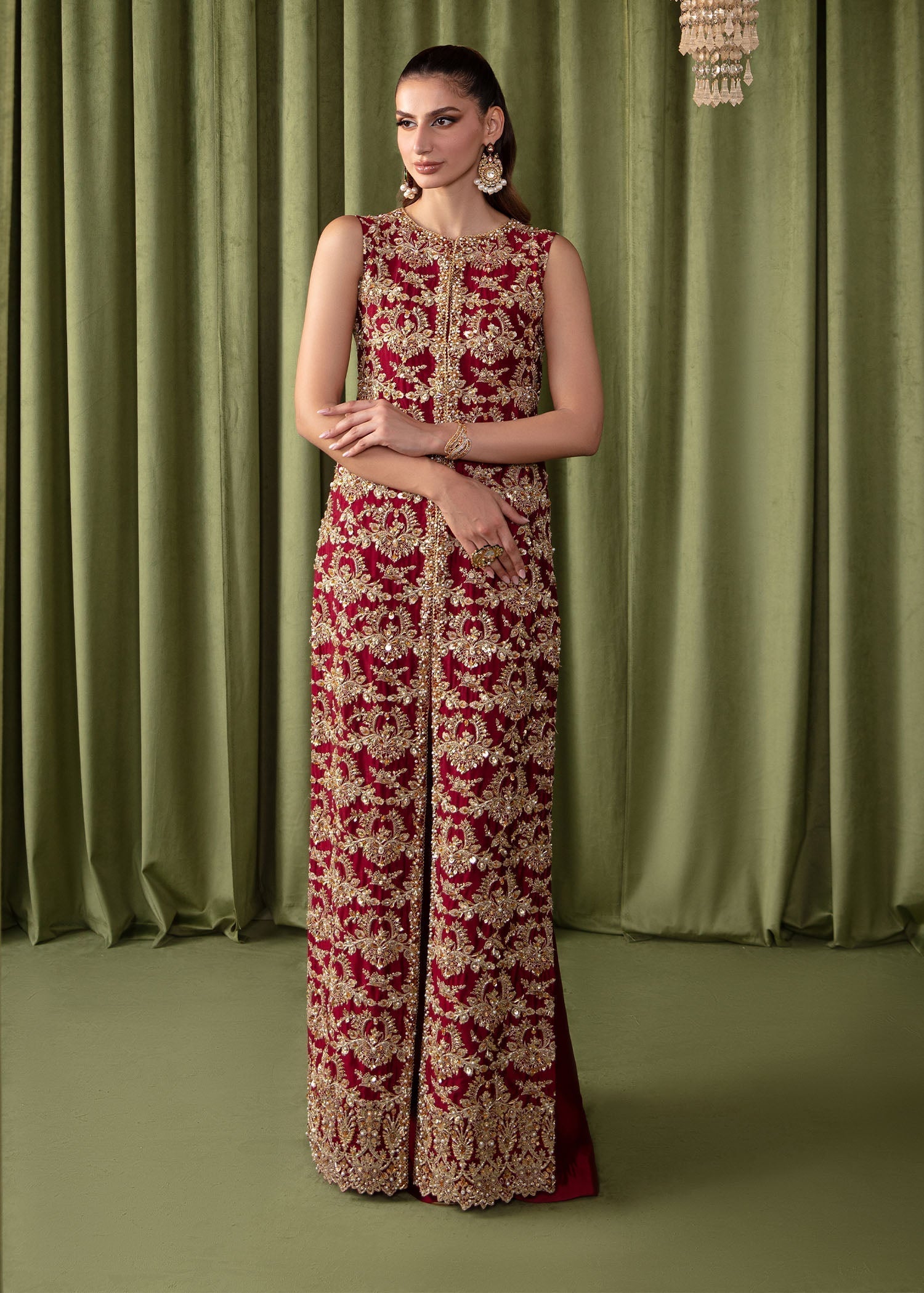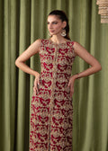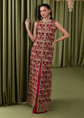 This article beautifully describes an elegant ensemble, starting with a delicately crafted red front-open long shirt. The shirt's base is adorned with gold tilla embroidery, adding a touch of regal charm. The hand-embellishments further enhance its allure, featuring intricate stitching, sequins, and crystals that glimmer and sparkle, creating a mesmerizing visual appeal. Paired with the flair tissue silk pants in a matching shade, completing the ensemble with sophistication and grace. The pants complement the intricate embellishments of the shirt, adding to the overall aesthetic. The delicate sequins and embroidery on the dress are not just decorative elements but true works of art, shimmering and reflecting light to capture attention and admiration.