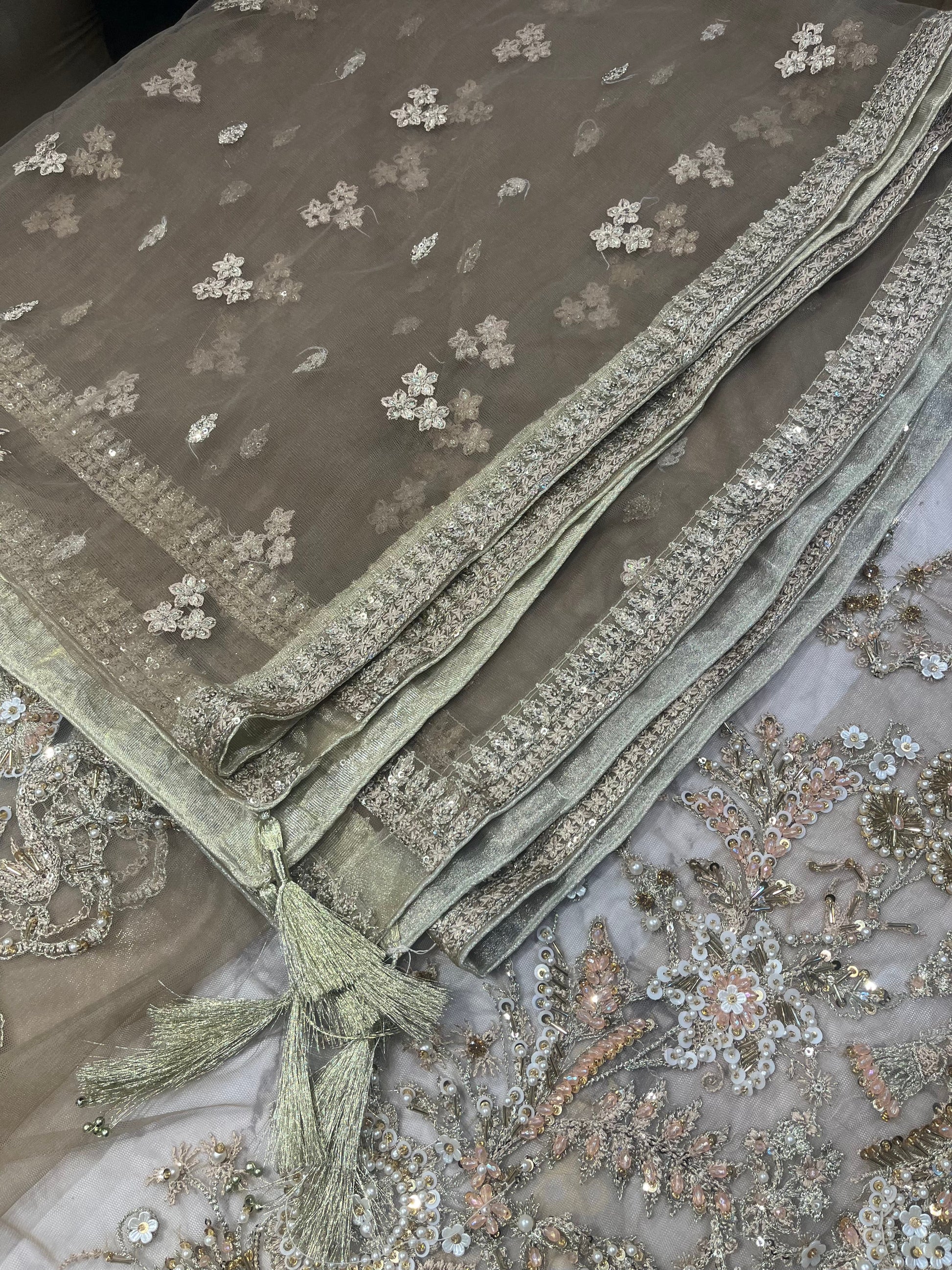 Yellow Golden master pc Lehenga Choli Dress Indian Bridal Wear is heavily decorated in golden white extensive worked open shoulder blouse paired with self-brocade panel lehnga with beautifully embroidered entire ghair in shades of ivory blossom pink and golds in traditional Organza fabric and Net Embroidered Choli. Your next wedding outfit is waiting for you. Golden Lehenga Choli: Take all the guests' attention with your exquisite look with one of the best master pc outfits of saira shakira . Comprising of a Golden organza round neckline blouse with complete zardozi work. This exceptionally embellished choli is paired with a jacket outfit which is organized with a fawn organza base choli which is sprayed with sequins glorifying its grace. Golden organza choli is emphasized with floral bunches done with kora, dabka, tilla, and sequins work. Making it true that you can turn all the heads around with your gorgeous ability to wear the outfit in a way that is spectacular. Golden Lehenga: Elevate your style this season with our fashion-forward designs. An artistic vision of classic style and luxurious detailing, transpire into a truly romantic and iconic bridal for your big day. An eye-captivating long silhouette is fully illustrated with antique embellishments all over. Furthermore, it is emphasized with an embellished waist belt and scalloped borders. Compliment the look with a wide-flared lehenga. The combination of gold work on organza is absolutely breathtaking in its amazing Style. The Lehenga incorporates beautifully designed borders having sprinkled sequins to give it a perfect maharani look. Bridal Dupatta: An artistic vision of classic style and luxurious detailing transpires into a genuinely romantic and iconic bridal wear for your big day, which will complete in this beautiful golden lehnga choli paired with a net chiffon dupatta.