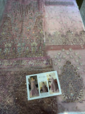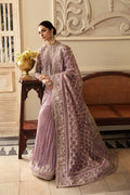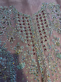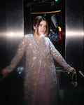 A perfect embodiment of celebration, ‘Sehr’ a graceful ensemble, featuring the timeless charm of dusty mauve. This lavishly adorned Organza Jacket and airy drape dupatta with enchanting screen print, is skillfully adorned with intricate hand embellishments work, pairied with a Crushed Sharara, adding a touch of traditional work.