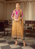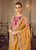 In the dimly lit room, SULTANIQUE emerges like a spectral bloom created with pure tissue in pale tangerine tone adorned with ethereal floral motifs paying homage to tales of ancient traditions. The ensemble celebrates old school elegance with each taanka laden carefully on the eclectic appliques creating a myriad of colors amalgamating convention with modernity. The turquoise green raw silk pants break the monotone of color and fabric exuding festivity and a mood of color and happiness.